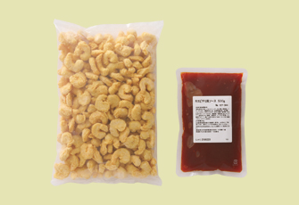 むきえびを国内工場にて丸ごとフリッターにしました。えびチリ用のソースもセットになっており、フリッターは油調で、チリソースは湯煎してご利用ください。