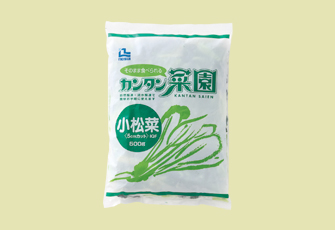 食べやすい大きさにカットし、ブランチング後、急速凍結した小松菜です。