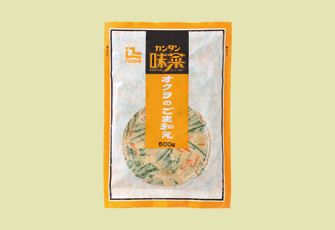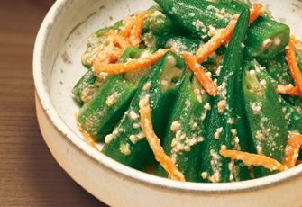 タイ産のオクラをハーフカットし、色合いに千切りにんじんを加えて、すりたてごまを使ったタレで味付けしました。