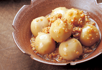 里芋をじっくり煮含めて、鶏そぼろ餡を加えました。ボイルしてからお召し上がりください。