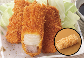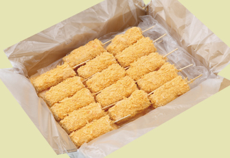 豚肉・たまねぎを加熱せずに生のまま仕上げた串かつです。製造時に加熱工程が無く生のままですので、肉の旨みが失われる事無くジューシーに揚げ上がります。